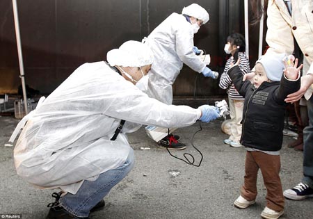 Đo phóng xạ cho người vừa rời khu vực nhà máy điện hạt nhân Fukushima số 1. Ảnh: AP